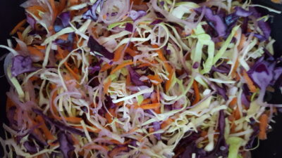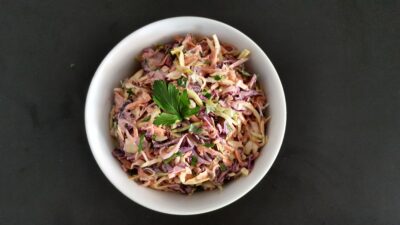 - Een scheut olijfolie en een scheut appelciderazijn of sap van een halve citroen. Of je favoriete dressing (uit een flesje).
