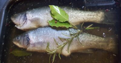 De zeebaars 1,5 uur in het pekelbad in de koelkast leggen,