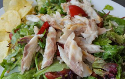 Fileer de vis en leg de stukjes bovenop de salade. Versier nog een beetje met dressing